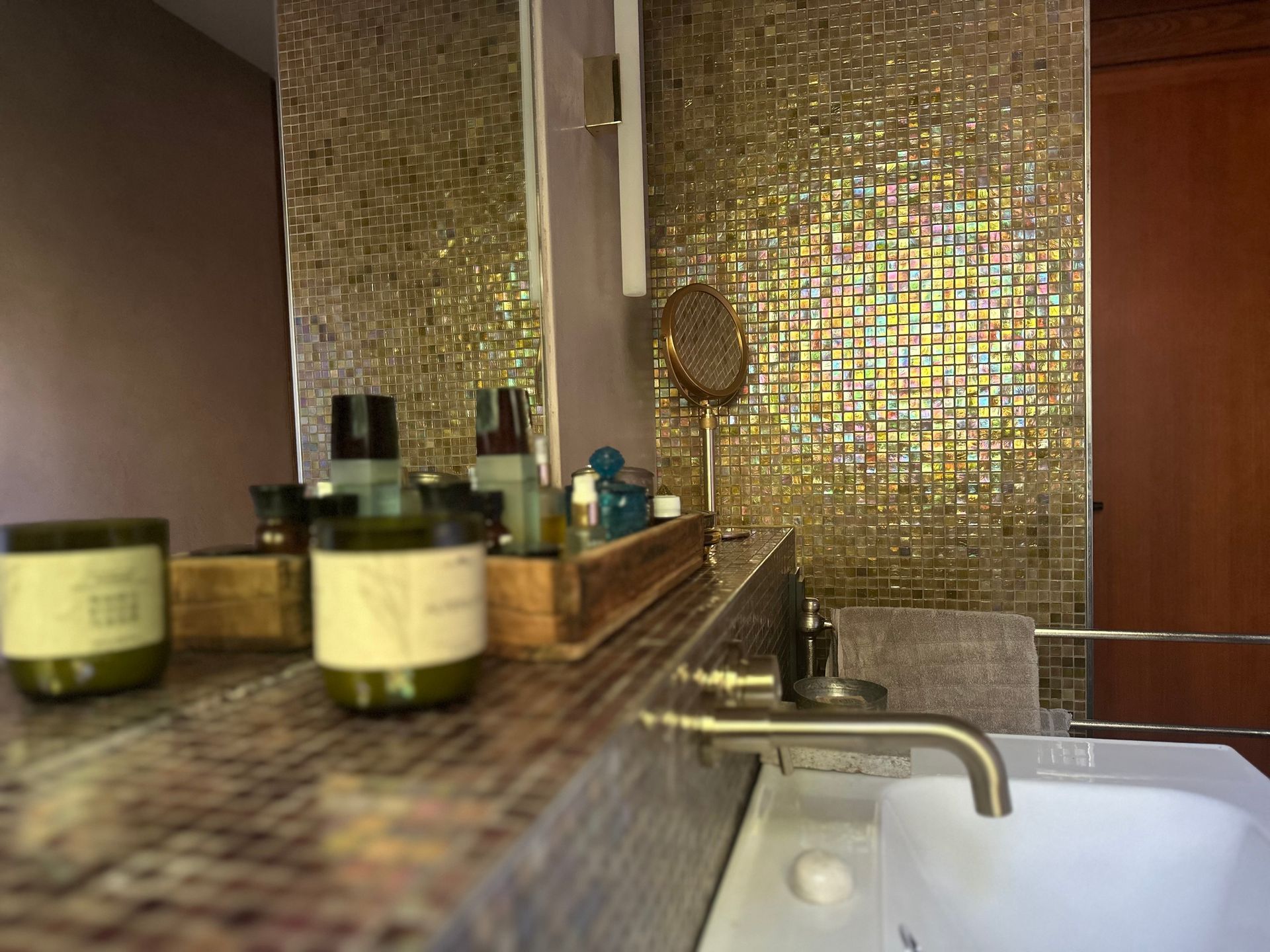 Ausdrucksstarke Oberflächen von warmer Haptik prägen das Haus. Douglasien-und Lärchenholz-Blockbohlen geben dem Haus seine naturverbundene Aura. Die Materialien erzeugen eine Atmosphäre, die kraftvoll und gleichzeitig beruhigend ist. Ein Spiel voller Lebendigkeit fängt das Licht ein und taucht die Räume in die Sonne, die das Anwesen den ganzen Tag lang umspielt. Aus edlen, 5m langen Eichendielen, sandfarbenem Kalkstein, exklusiven, schillernden Sicis-Mosaikfliesen und traditionellen Tadelakt-Wandflächen gefertigt, bietet das Anwesen den Luxus der Reduktion und schafft neue Dimensionen. Der Außenraum verschmilzt mit dem Inneren des Hauses. Großzügig umschließt der Park das Holz-Blockhaus rundum. Das perfekte Refugium für Menschen, die Überflüssiges loslassen und sich erden möchten.