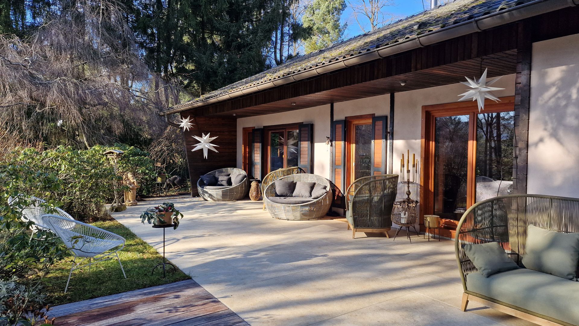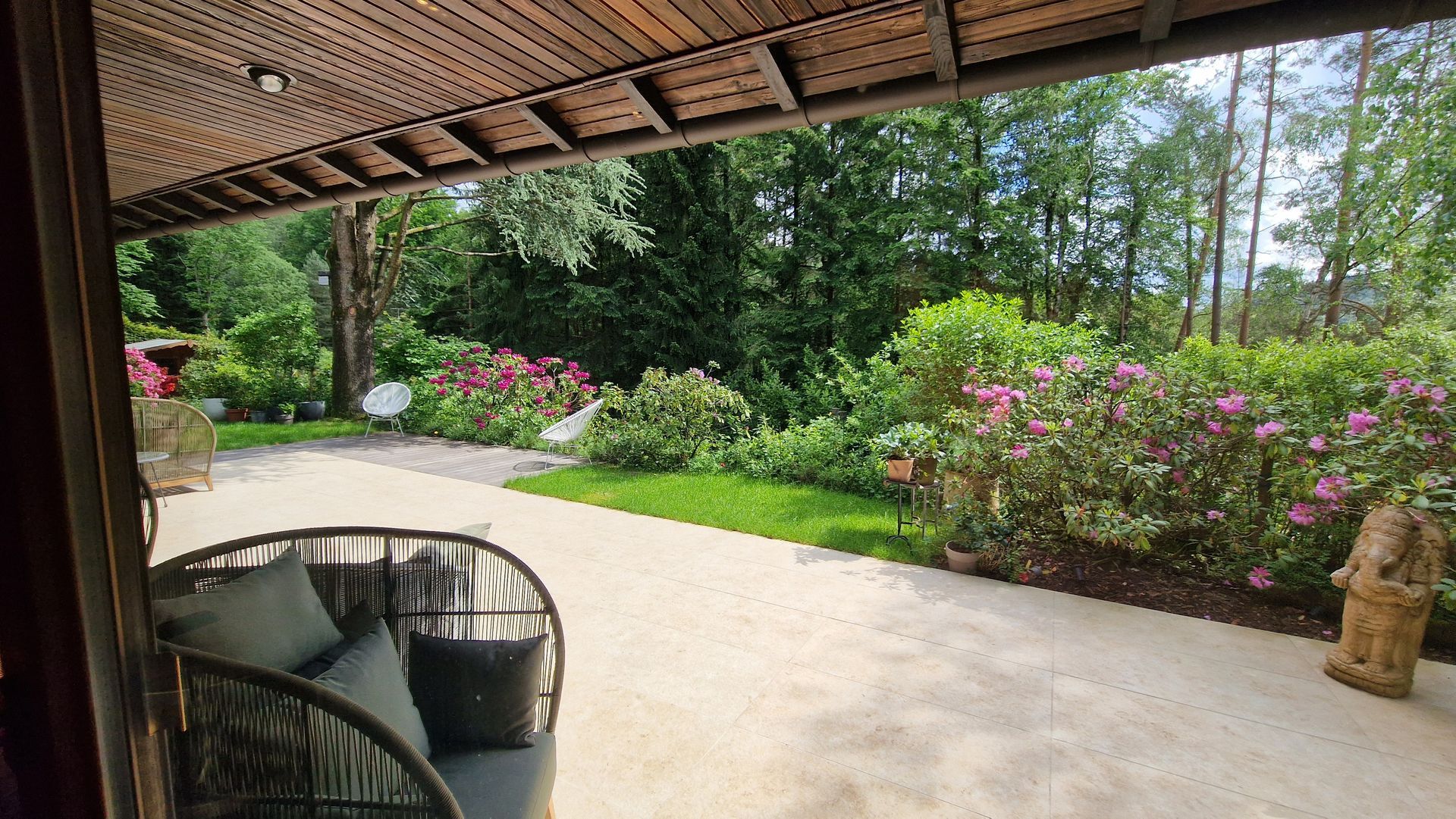 Der schöne Park mit alten Gehölzen stuft sich über den Hang ab und schließt das Blockhaus in sich ein. Farbige Rhododendronbüsche, Magnolie, Blühpflanzen und Sträucher, Hängebuche und zwei imposante Zedern verleihen dem Park einen Hauch von Exotik und staffeln sich in verschiedenen Ebenen, sodass der Blick frei schweifen kann. Die Sonne wandert tagsüber über die Gehölze und taucht den Park in sonnige, lichtflimmernde und schattige Bereiche. Terrasse und Bali-Areal bilden zwei Aufenthaltsorte von differenzierter Qualität. Ein Scheidholz-Außenkamin und der große massive Holztisch mit Sitzbank bieten Platz für Stunden mit Freunden und Familie.