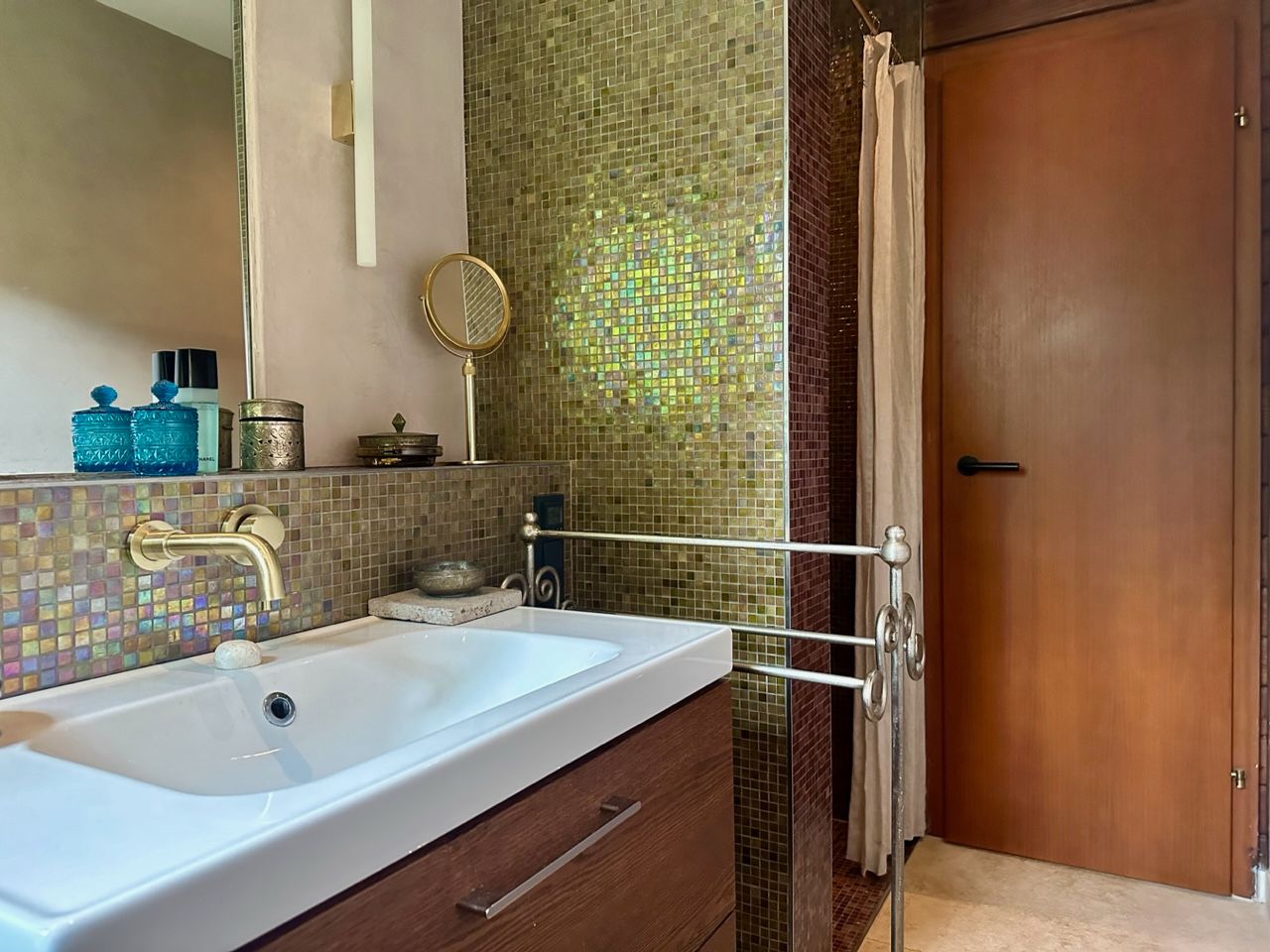Ausdrucksstarke Oberflächen von warmer Haptik prägen das Haus. Douglasien-und Lärchenholz-Blockbohlen geben dem Haus seine naturverbundene Aura. Die Materialien erzeugen eine Atmosphäre, die kraftvoll und gleichzeitig beruhigend ist. Ein Spiel voller Lebendigkeit fängt das Licht ein und taucht die Räume in die Sonne, die das Anwesen den ganzen Tag lang umspielt. Aus edlen, 5m langen Eichendielen, sandfarbenem Kalkstein, exklusiven, schillernden Sicis-Mosaikfliesen und traditionellen Tadelakt-Wandflächen gefertigt, bietet das Anwesen den Luxus der Reduktion und schafft neue Dimensionen. Der Außenraum verschmilzt mit dem Inneren des Hauses. Großzügig umschließt der Park das Holz-Blockhaus rundum. Das perfekte Refugium für Menschen, die Überflüssiges loslassen und sich erden möchten.
