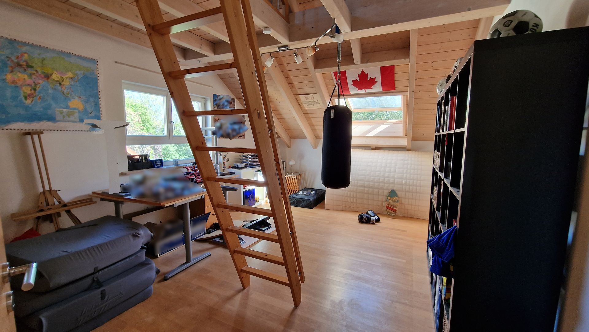 4 baugleiche, helle, geräumige Kinderzimmer - jedes mit Empore - im OG. Parkettböden, Naturholz, Lehmputz, Naturanstriche.